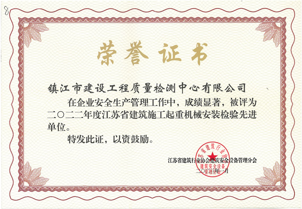 近日,江苏省建筑行业协会建筑安全设备管理分会对省内建筑施工起重机械安装检验单位进行综合评比,共19家检验单位被评为“2022年度江苏省建筑施工起重机械安装检验先进单位”。我中心凭借优质的服务,过硬的质量和技术管理再次获得该项荣誉称号。中心将继续努力提高自身的检验能力,以更高效更优质的服务回馈我们每一位客户!