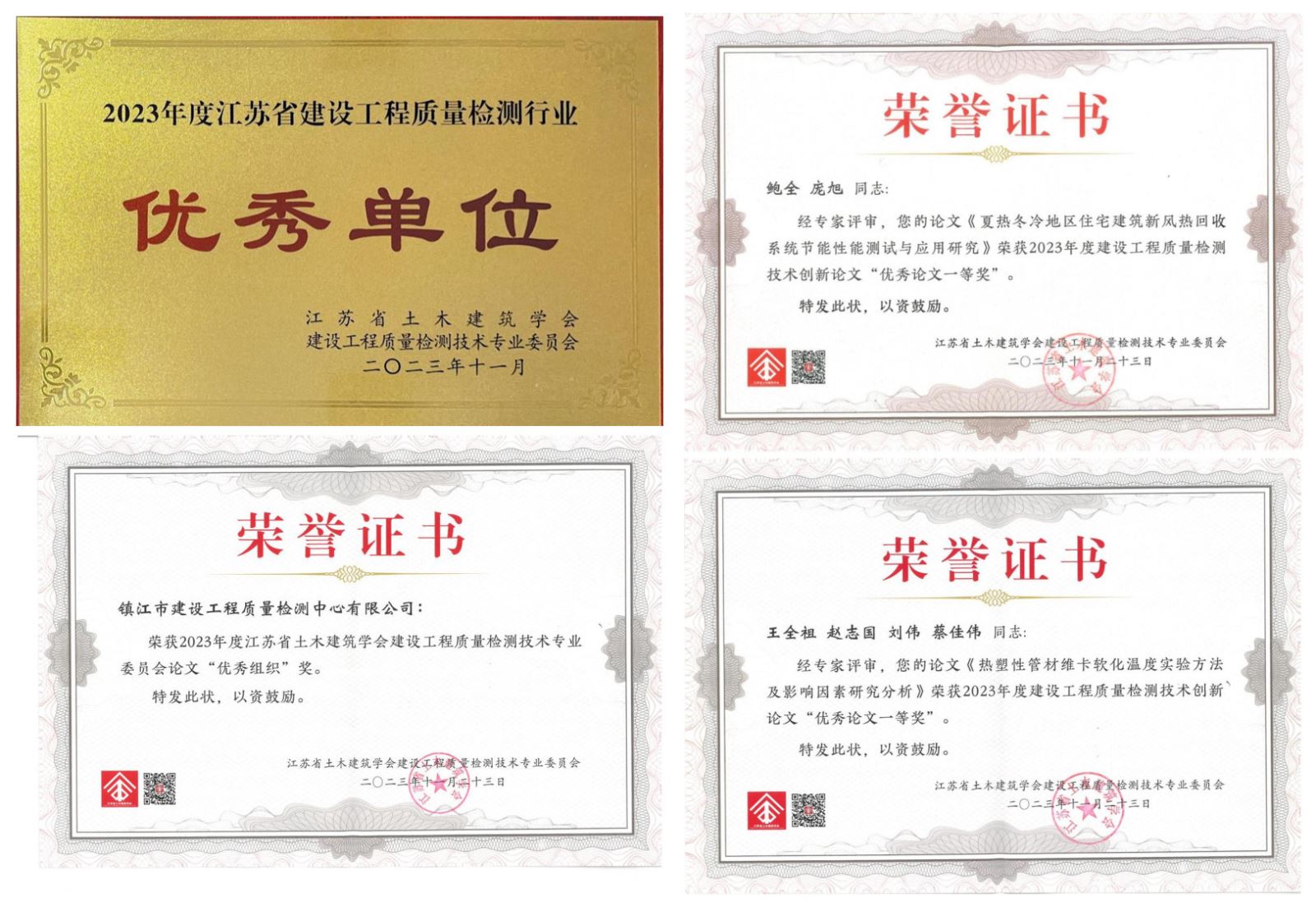 检测中心获江苏省土木建筑学会“2023年江苏省建设工程质量检测先进单位”、“优秀组织奖”等荣誉