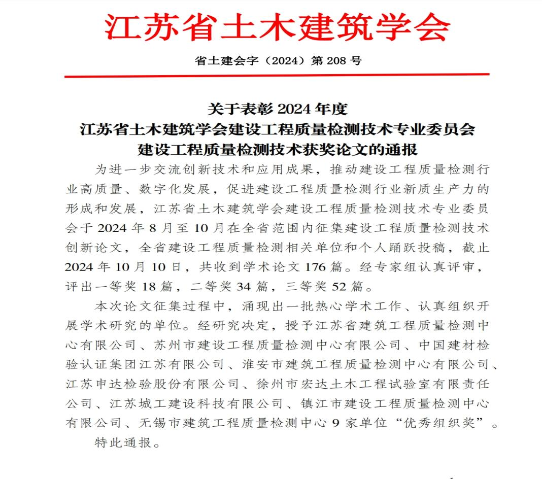“2024年度建设工程质量检测技术获奖论文的通报”。在此次通报中,我中心收获颇丰。员工杨继彬、鲍全等人的论文成果卓越,成功摘得学会颁发的优秀论文一等奖桂冠,另有七篇论文凭借其严谨的研究与独特的见解,分别斩获二、三等奖。同时,中心还被授予